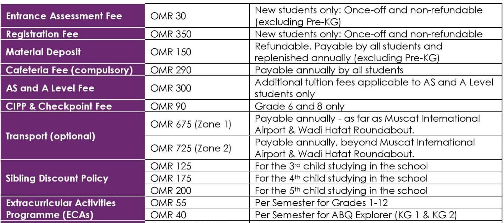 | Pre-KG (ABQ Explorer) | Various payment models available | From OMR 5 per month |