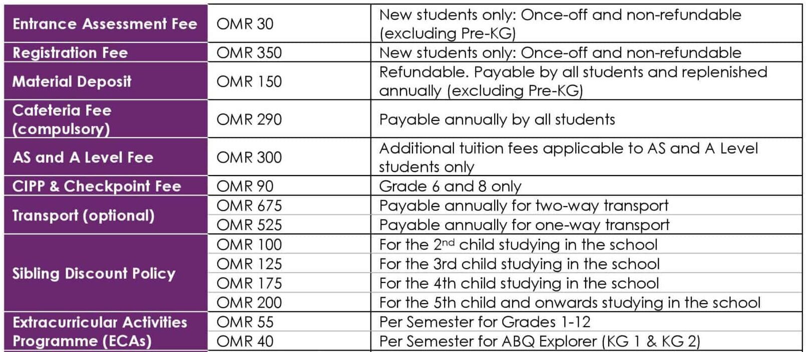 | Pre-KG (ABQ Explorer) | Various payment models available | From OMR 5 per month |